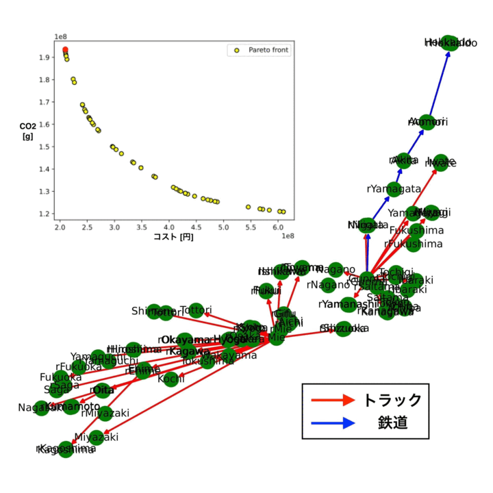 近年、「物流2024年問題」対策や「カーボンニュートラル実現」に向け、道路輸送から鉄道貨物への転換が進められている。これら二つの輸送モードの組合せによる輸送コストとCO2排出量のパレート解を求め、そのトレードオフ関係を明らかにする。